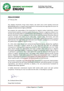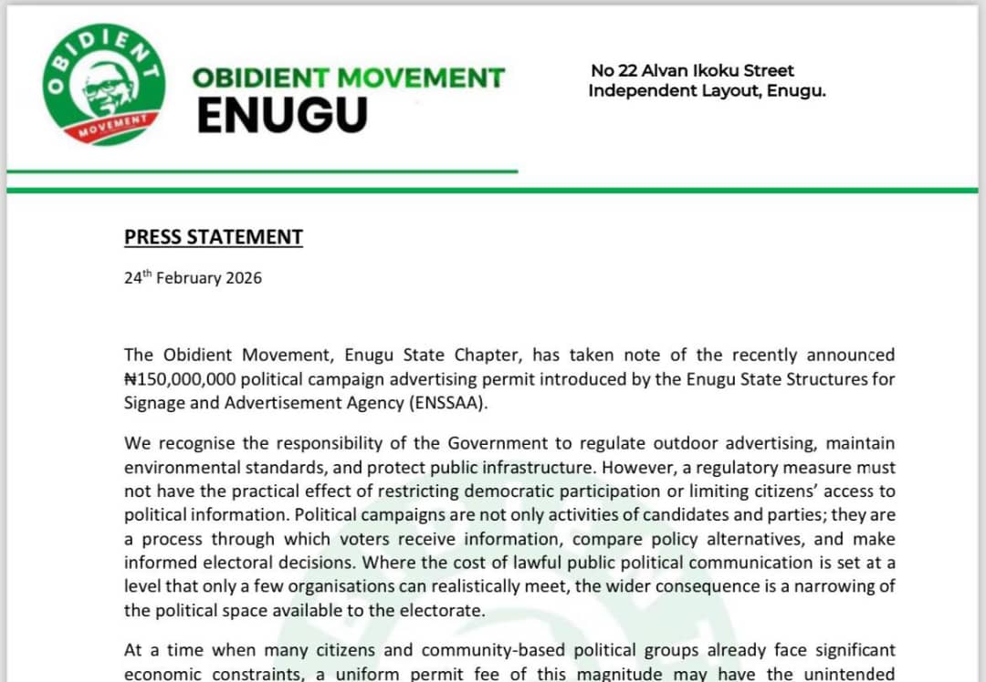(DDM) – The Obidient Movement in Enugu State has strongly criticised a newly introduced ₦150 million political campaign advertising permit imposed by the Enugu State Structures for Signage and Advertisement Agency (ENSSAA), warning that the measure could stifle democratic participation ahead of future elections.