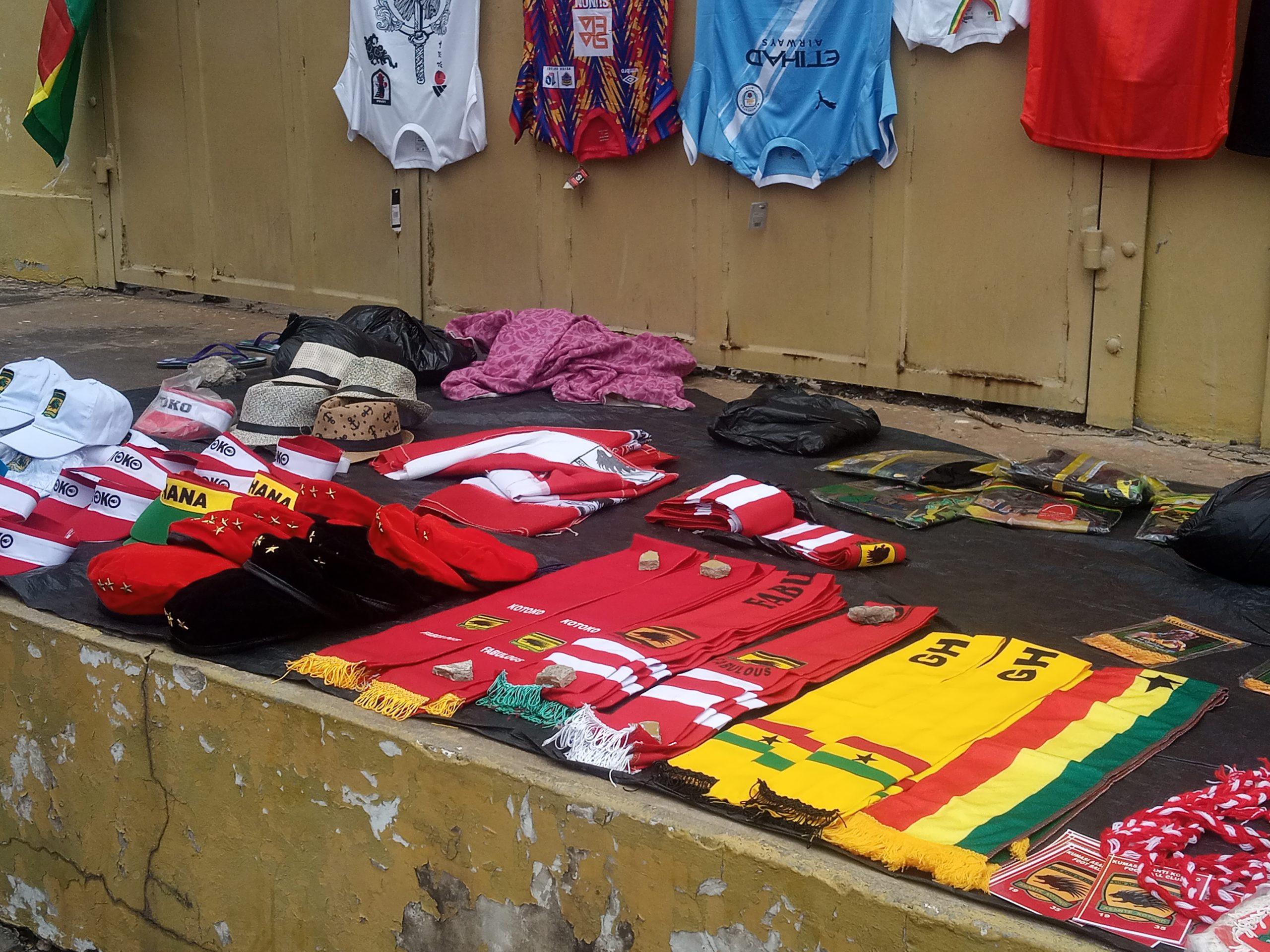 Her stall is a mini football bazaar—fez caps, mufflers, shirts, and trinkets splashed with club crests.