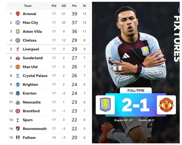Aston Villa have significantly intensified the Premier League title race after securing a dramatic home victory over Manchester United, a result that capped a remarkable seventh consecutive league win and reshaped the final league table at the close of the matchday.