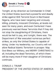Nigeria’s Federal Government later confirmed the airstrikes, stating that they were conducted under an existing framework of security and intelligence cooperation between Abuja and Washington.