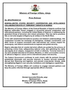 In a statement issued by the Ministry of Foreign Affairs, the government said the collaboration involved intelligence sharing and strategic coordination in line with international law and Nigeria’s sovereignty, adding that all counter-terrorism efforts prioritised civilian protection and national unity.