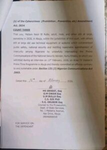 The third count contends that by using technical equipment to intercept Ribadu’s calls, the defendants endangered public safety, national security, and instilled “reasonable apprehension” among Nigerians, in violation of sections 12(1) of the Cybercrimes (Prohibition, Prevention, etc.) (Amendment) Act 2024 and 131(2) of the Nigerian Communications Act 2003.