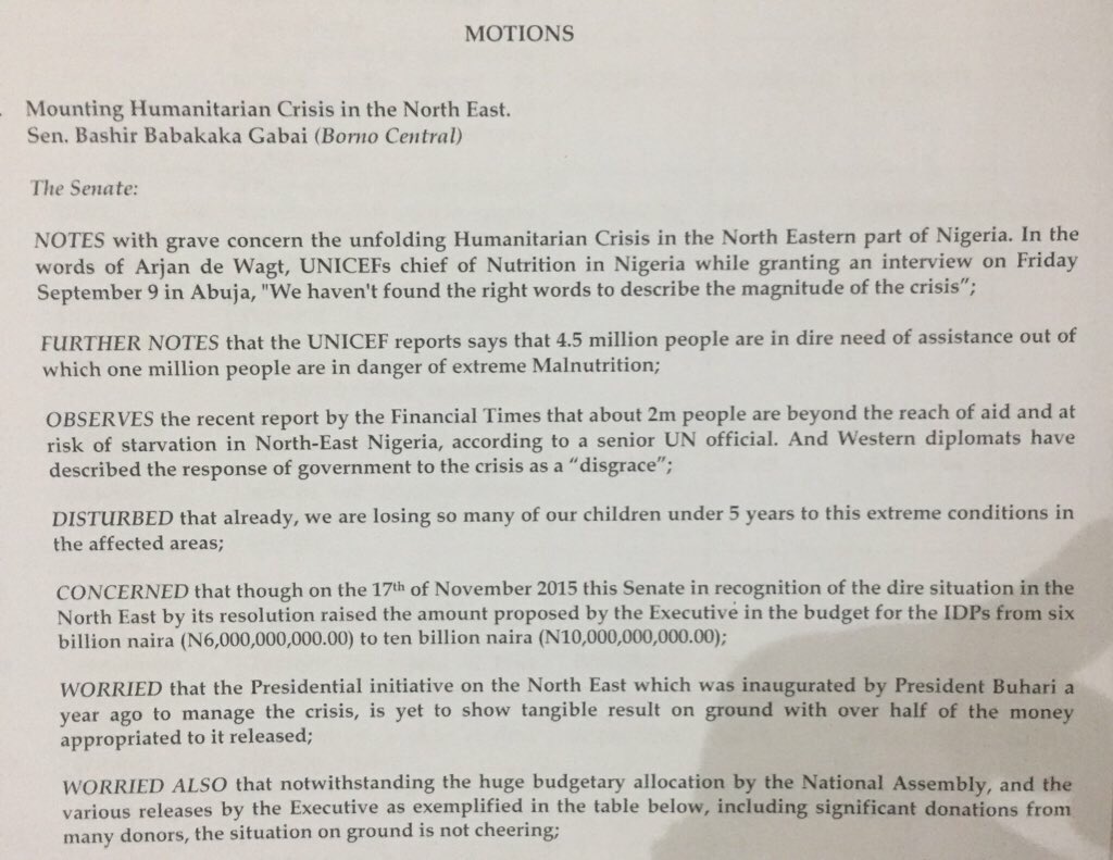 Recall that on 17 November, 2015, in recognition of dire situation in North East, the Senate by resolution raised amount proposed by executive in budget for IDP from 6 billion to 10 billion Naira.