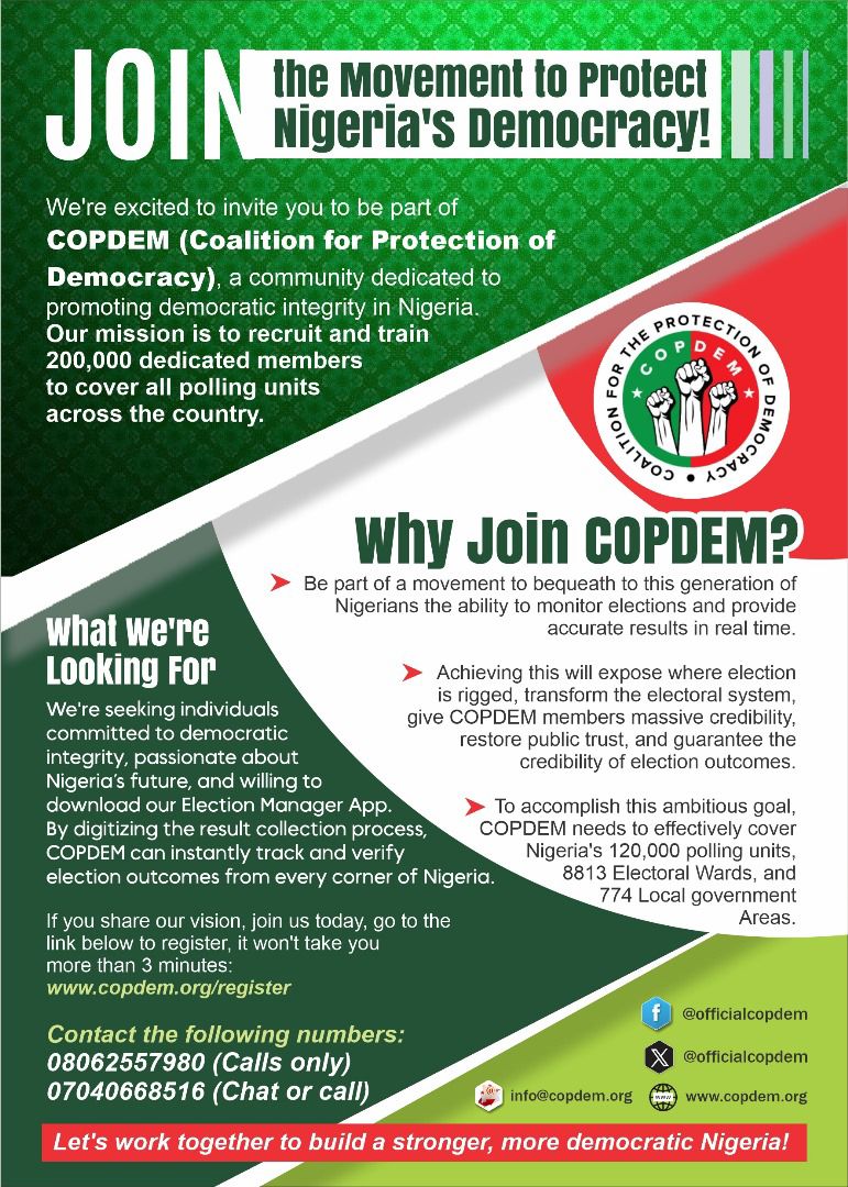 To join the movement, interested citizens are urged to register through the official portal: www.copdem.org/register, or contact the organization’s office lines at 08062557980 and 07040668516.