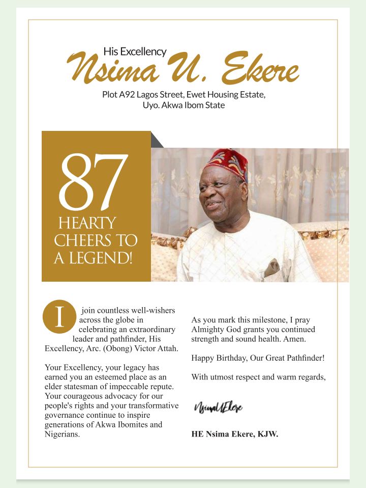 Former Deputy Governor of Akwa Ibom State, Obong Nsima Ekere, has joined a global chorus of well-wishers in celebrating former Governor, Arc. (Obong) Victor Attah, as he marks his 87th birthday, saluting him as “an extraordinary leader and pathfinder.”