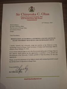 In his letter of resignation dated 23 February, 2026, sited by our reporters, addressed to the Governor of Enugu State, Dr. Peter Ndubuisi Mbah, the Visitor to to the University, Sir Ohaa wrote, “I hereby formerly and voluntarily resign my position as the Chairman of the Governing Council of Enugu State University of Science and Technology (ESUT) effective from February 23, 2026.”