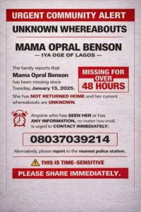 As the search continues, the disappearance of Opral Benson has cast a somber mood over Lagos’ cultural and social landscape. For many, she represents not only elegance and tradition but also decades of service across multiple sectors. Her absence is deeply felt, and hopes remain high that with intensified efforts, cooperation from the public, and swift action by security agencies, she will be found and reunited with her loved ones.
