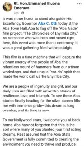 Rt. Emeruwa reaffirmed that authentic Aba stories would be told through cinema, aiming to resonate across Nigeria and internationally.