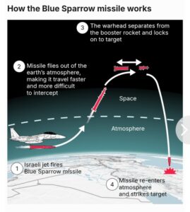The weapon reportedly used in the decisive strike was an advanced air-launched missile known as the Blue Sparrow, developed by Israel’s defense industry. Unlike conventional cruise missiles that fly low across terrain, the Blue Sparrow follows a quasi-ballistic trajectory. After launch from a fighter jet, it climbs steeply into the upper atmosphere before descending rapidly toward its target at high speed. This unusual flight path gives defenders very little time to react and makes interception extremely difficult, particularly when air defenses are already compromised.