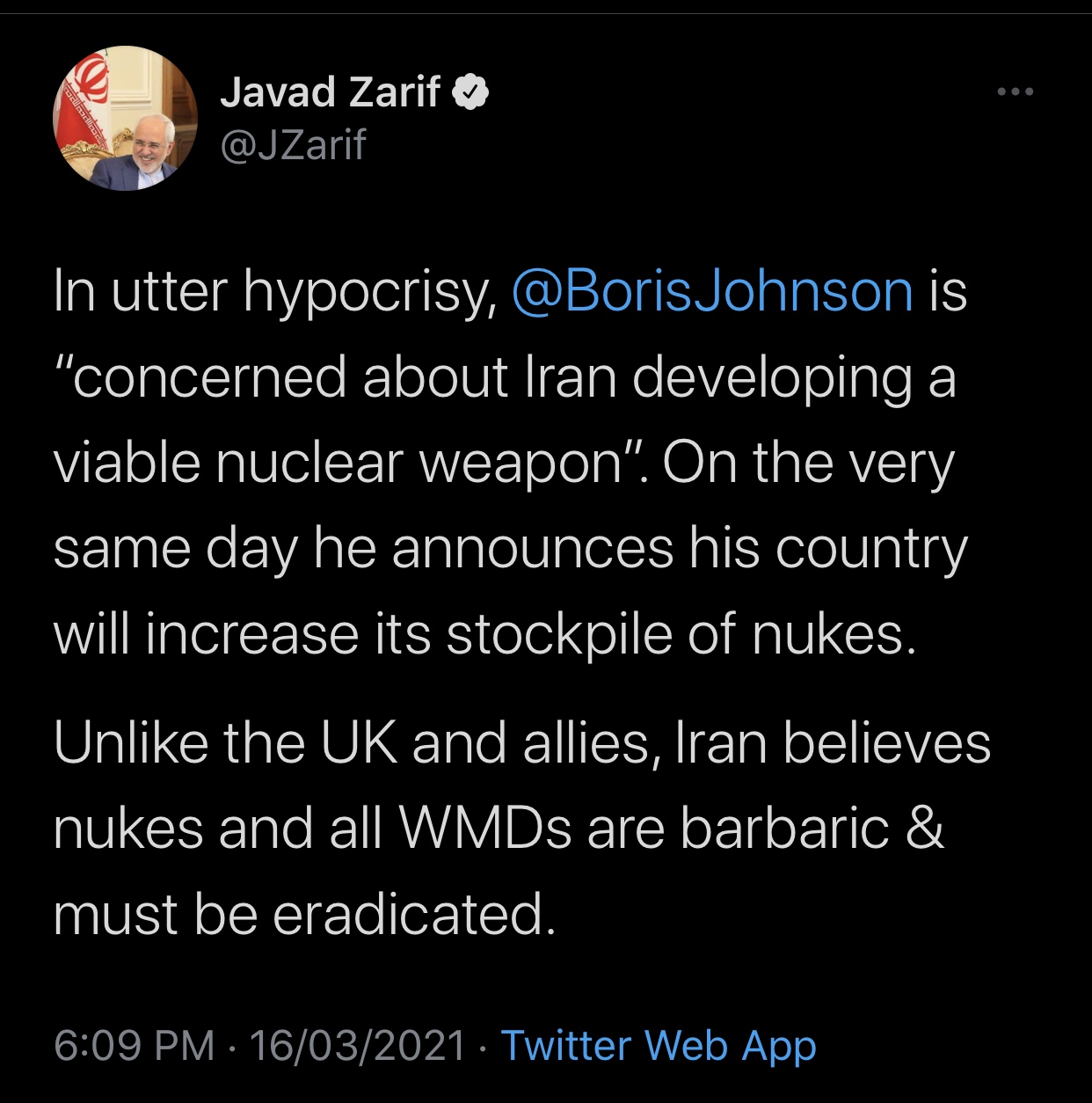 In a tweet on Tuesday, the top diplomat condemned the fact that British Prime Minister Boris Johnson expressed concern about Iran’s nuclear programme on the same day he announced the UK will increase its stockpile of nuclear warheads by 40 percent.