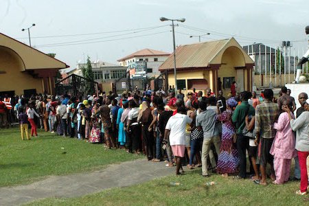 The Lake rice queue at Teslim Balogun Stadium, Surulere in Lagos on Friday