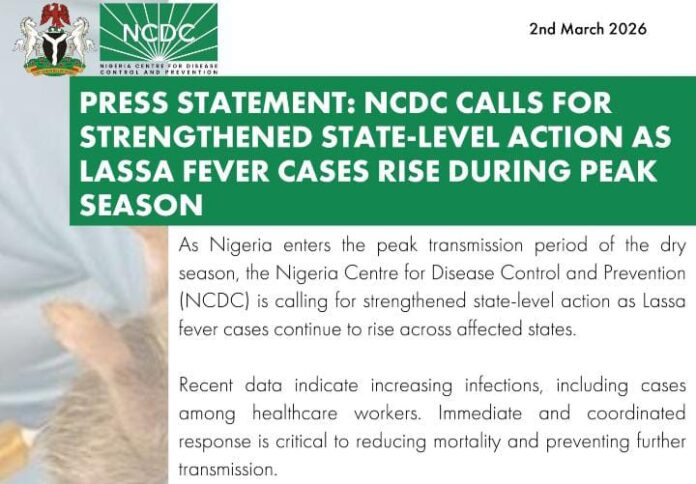 (DDM) – The Nigeria Centre for Disease Control and Prevention (NCDC) has issued an urgent call for stronger state-level action as Lassa fever cases continue to rise during Nigeria’s peak dry season between November and April.