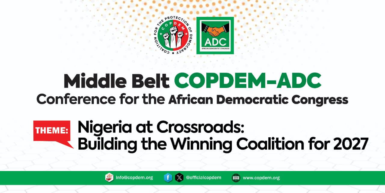 Jos, Plateau State, Nigeria – 23 March 2026. The Middle-Belt Chapter of the Coalition for the Protection of Democracy (COPDEM), in strategic alliance with the African Democratic Congress (ADC), is set to host a landmark political conference titled “Nigeria at Crossroads: Building the Winning Coalition for 2027”. The conference will take place in Jos, Plateau State, Nigeria, commencing at 12:00pm.