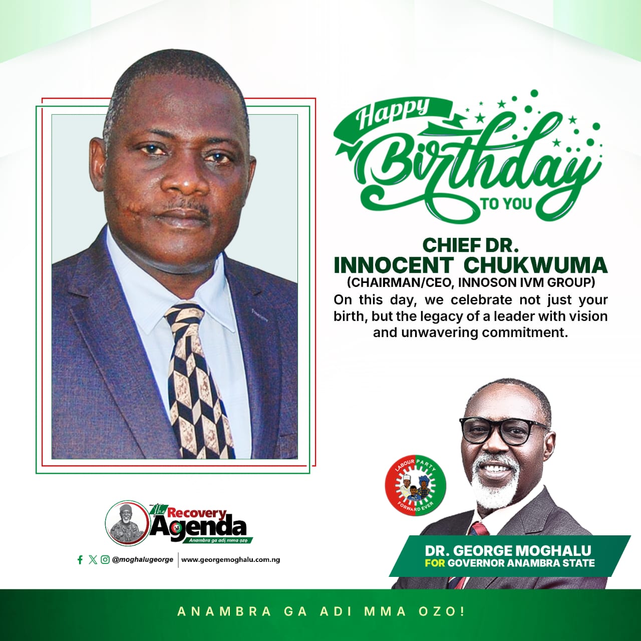 (DDM) – Labour Party Governorship Candidate in the forthcoming Anambra election, Chief Dr. George Moghalu (Ohamadike Nnewi), has congratulated Chief Innocent Ifediaso Chukwuma, Chairman of Innoson Vehicle Manufacturing (IVM), on the occasion of his 65th birthday.