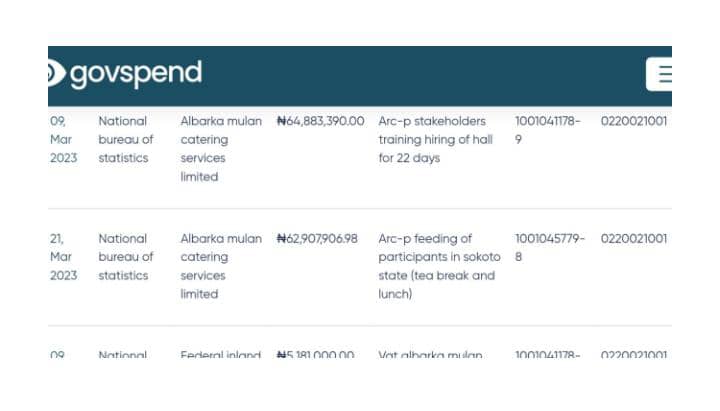 Barely seven weeks later, on March 9, 2023, Albarka Mulan received a payment of ₦64.8 million from the National Bureau of Statistics (NBS) for “Arc-P stakeholders training hiring of hall for twenty-two days.”