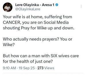 (DDM) – Political aide and media strategist, Lere Olayinka, has stirred heated debate on social media after questioning the priorities of a man who allegedly focused on praying for the Federal Capital Territory (FCT) Minister, Nyesom Wike, while his own wife is said to be battling cancer.