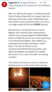 “We welcome U.S. interventions to assist Nigeria,” he wrote, “but certainly Jabo community in Sokoto was a wrong target for ISWAP, Boko Haram, or ISIS, who are known to be operating in the North-East Nigeria.”