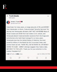 According to the U.S. president, Cuba has for years depended heavily on subsidised Venezuelan oil and financial assistance, which he claimed were exchanged for security and intelligence support provided to the Venezuelan government under President Nicolás Maduro.
