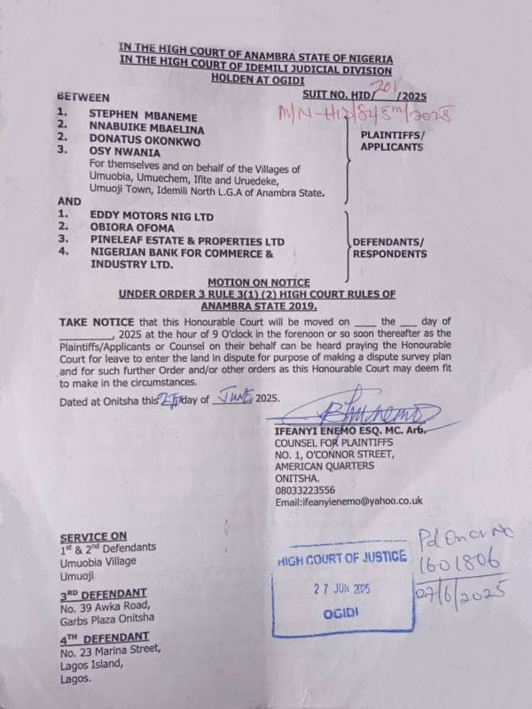 A lawsuit, with file number, HID/20/2025, was instituted in June, 2025, at the High Court of Anambra State holden at Ogidi.
