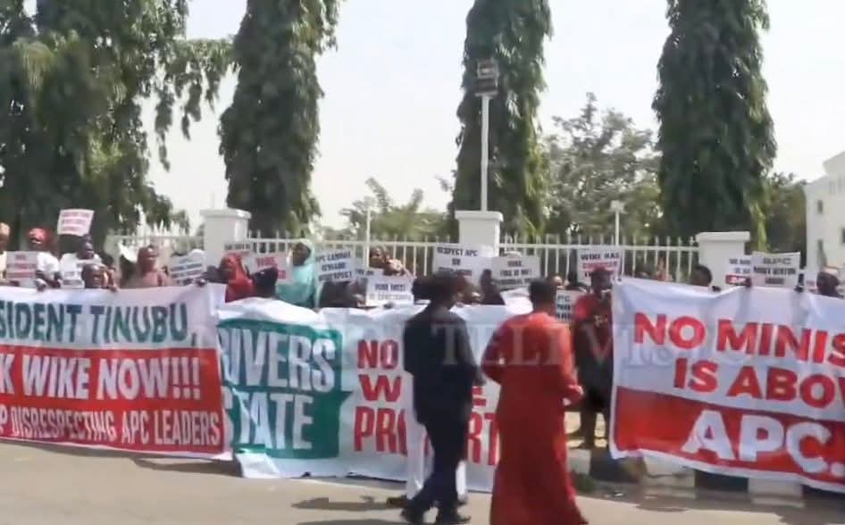 The protesters converged on the APC secretariat on Friday with placards bearing inscriptions such as “President Tinubu, sack Wike now” and “Stop disrespecting APC members”.
